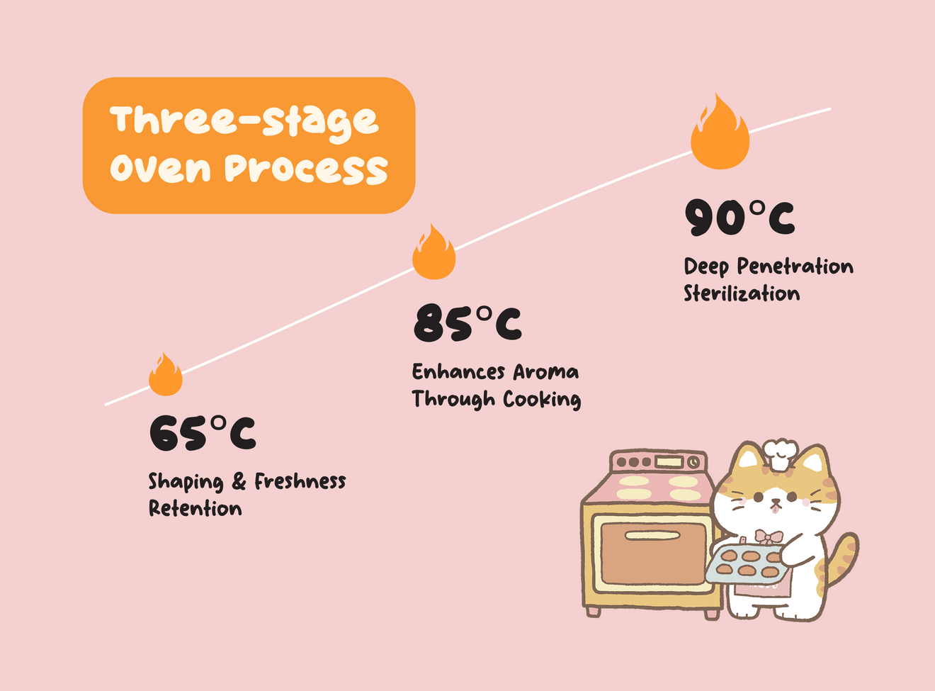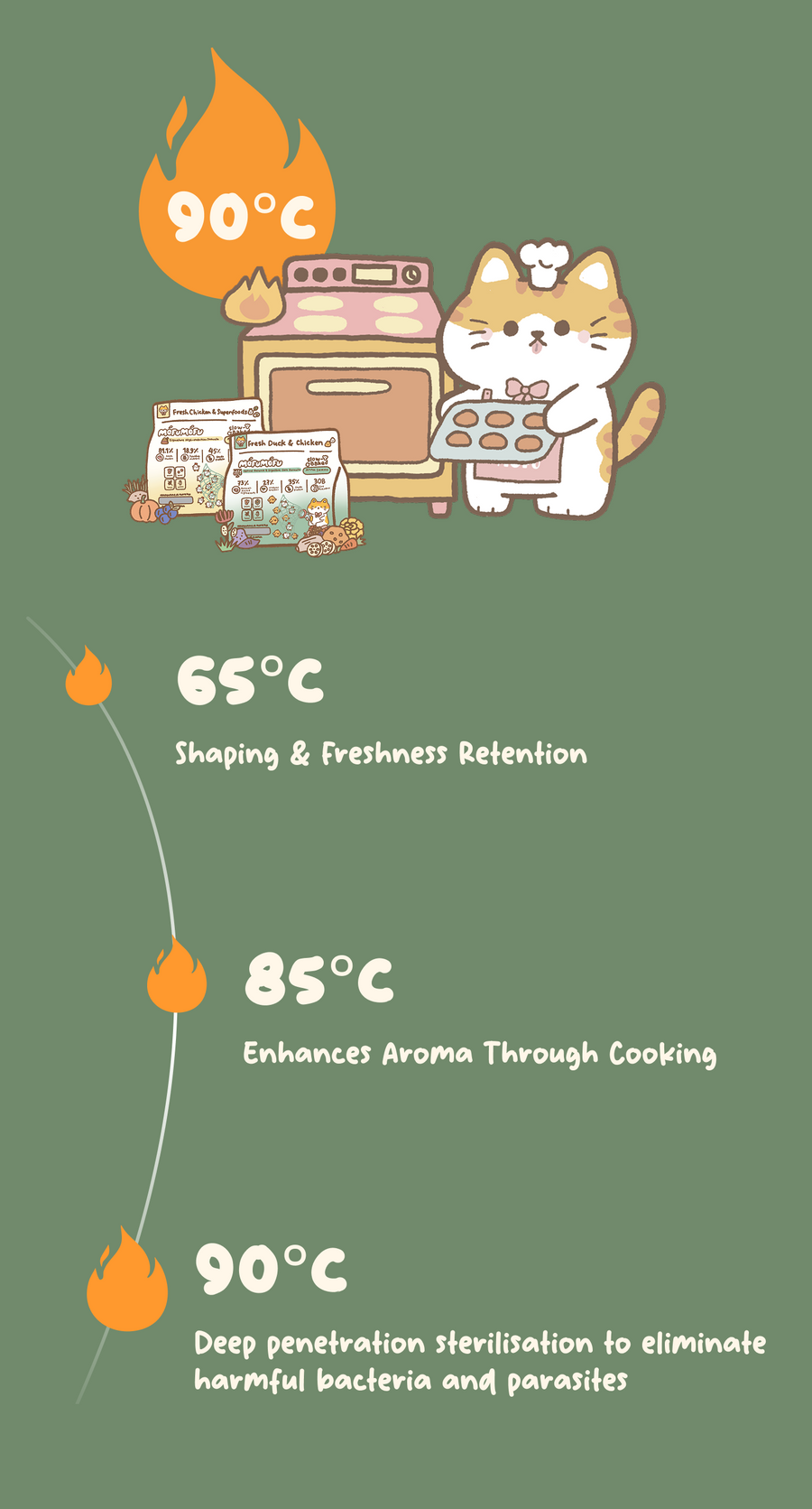 Most dry pet food is produced using high-heat extrusion, where ingredients are cooked quickly at very high temperatures. While efficient, this process can compromise nutrient integrity and often relies on surface oil coating and artificial palatants to restore taste and aroma (so your cats don’t hate it).